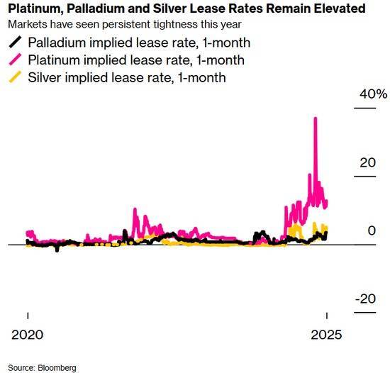与此同时,其他贵金属今年遭遇空前供应紧张。随着数年供应短缺问题集中爆发,伦敦市场可自由流通金属库存不断萎缩引发担忧。白银、铂金和钯金的租赁利率(反映通常为短期的金属借贷成本)均已飙远高于近零的正常水平。
