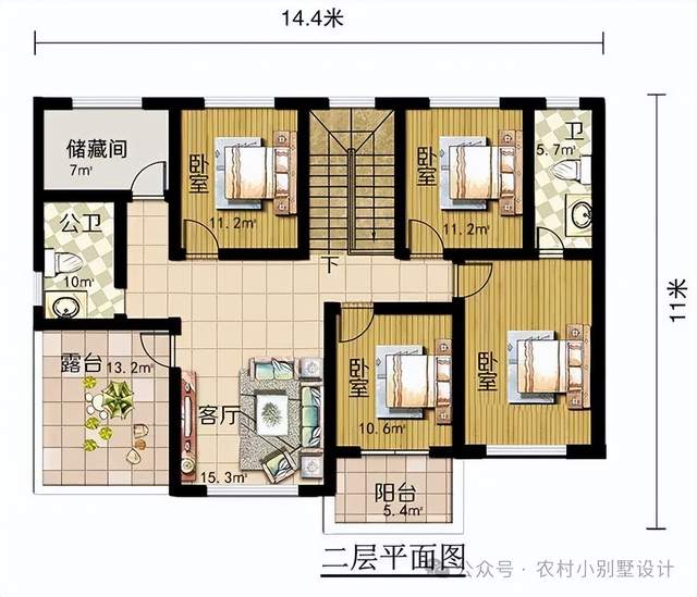 二层布局设置四个卧室,分别为三个次卧和一个带私卫的主卧,其中靠北侧次卧室分别在楼梯间东西两侧,上下出入比较方便。南侧次卧室直通阳台,方便晾晒休闲。公卫和储藏室布置在西北角,靠近露台和客厅。